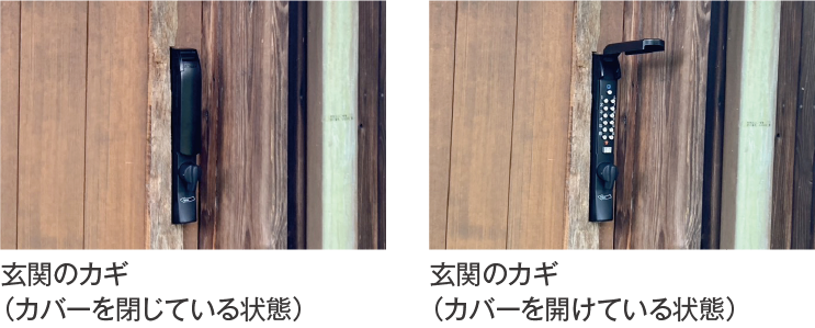 玄関カギのカバーを開き、事前にメールにて送った4桁の暗証番号を入力後、下部の「▽」ボタンを押すと解錠します。リセットする場合は上部の「□」ボタンを押して、再入力をしてください。